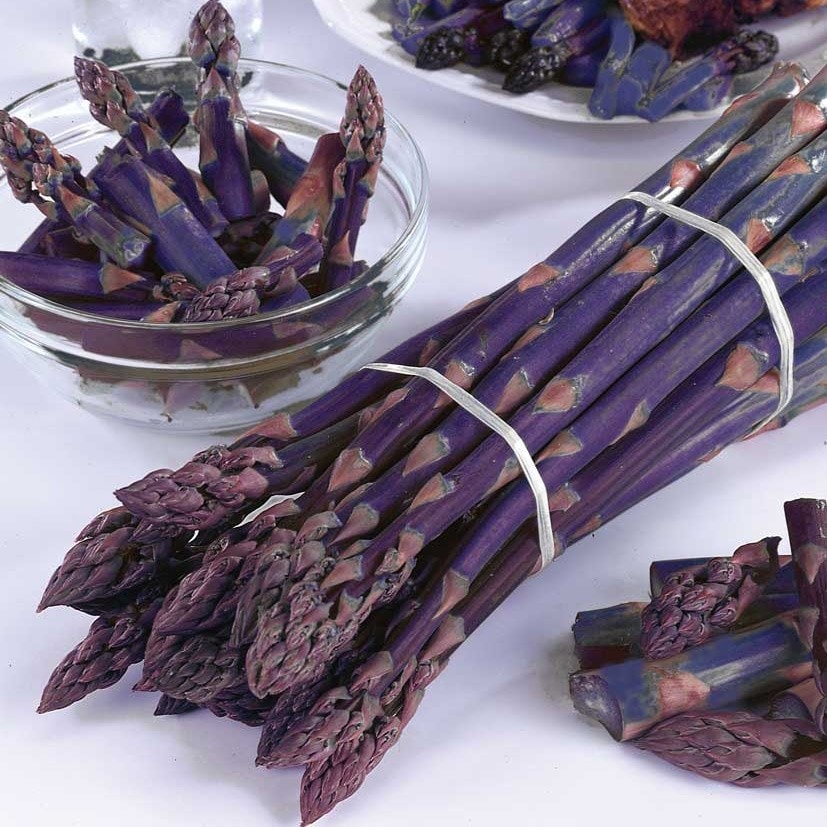 Producing thick, tender purple spears from May into early June, Asparagus 'Pacific Purple' is a reliable, early cropping variety known for its naturally sweet flavour when cooked. The vibrant spears add colour to the vegetable garden and are easy to spot when harvesting.