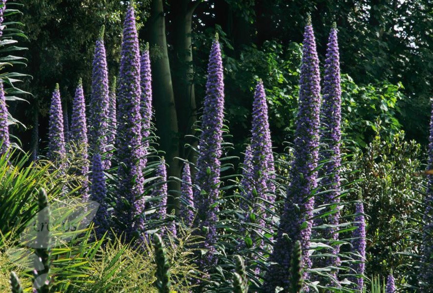 A dramatic addition to the garden, echium produces exceptionally tall flower spikes packed with purple-blue flowers, and towers above everything else in the border in mid to late summer. The rough, dark green, lance-shaped leaves studded along its length give it an architectural silhouette in the dying sunlight, and it is particularly suitable for an exotic planting scheme. It is a biennial or short-lived perennial and likes to be kept dry. Not one for the timid gardener. - Garden care: In frost-prone areas protect plants with frost fleece. These spectacular plants will usually die after they have finished flowering.