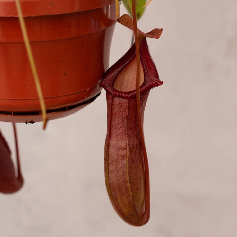 Nepenthes thrive in warm, humid, and partly shady environments, daytime temperatures should be maintained around 18-27°C (65-80°F), with a minimum of 7°C (45°F) at night, making them ideal for year-round indoor cultivation. They prefer being watered with rainwater, and many species benefit from sitting in a saucer filled with 2.5-5cm (1-2in) of water during the growing season. In winter, it's best to keep the compost damp rather than wet. Never add water into the pitchers as this can cause them to shrivel and die. Pot on in spring using a specialist carnivorous compost.