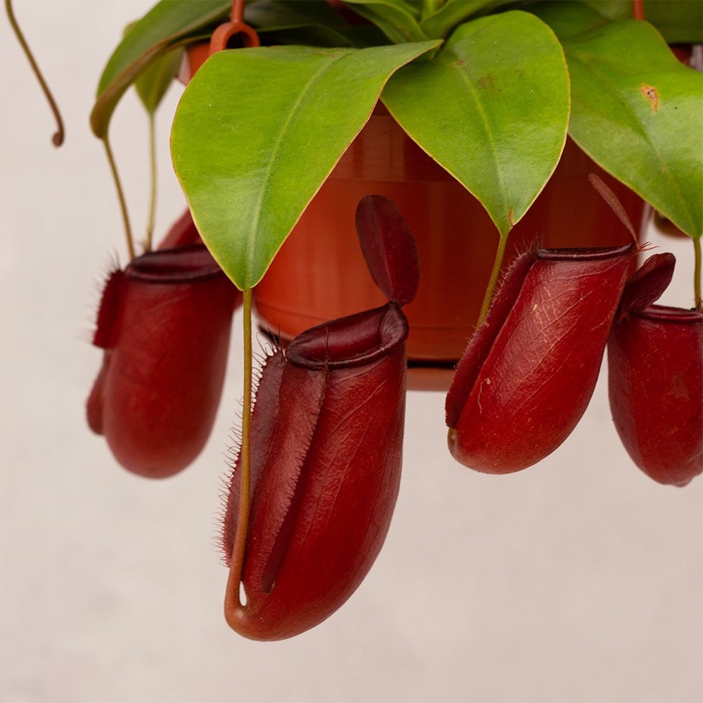 Nepenthes thrive in warm, humid, and partly shady environments, daytime temperatures should be maintained around 18-27°C (65-80°F), with a minimum of 7°C (45°F) at night, making them ideal for year-round indoor cultivation. They prefer being watered with rainwater, and many species benefit from sitting in a saucer filled with 2.5-5cm (1-2in) of water during the growing season. In winter, it's best to keep the compost damp rather than wet. Never add water into the pitchers as this can cause them to shrivel and die. Pot on in spring using a specialist carnivorous compost.