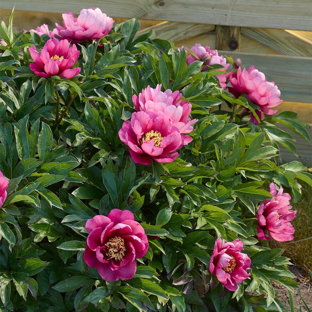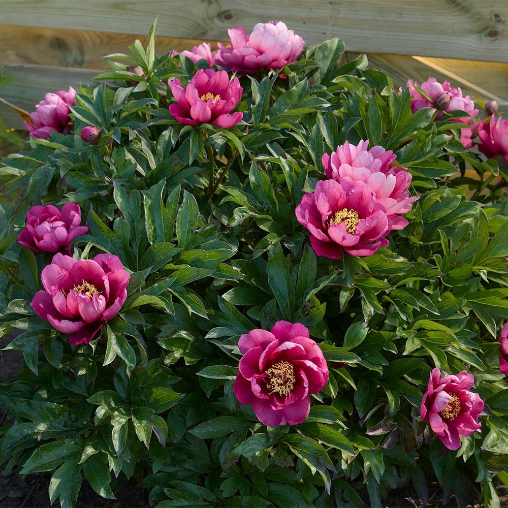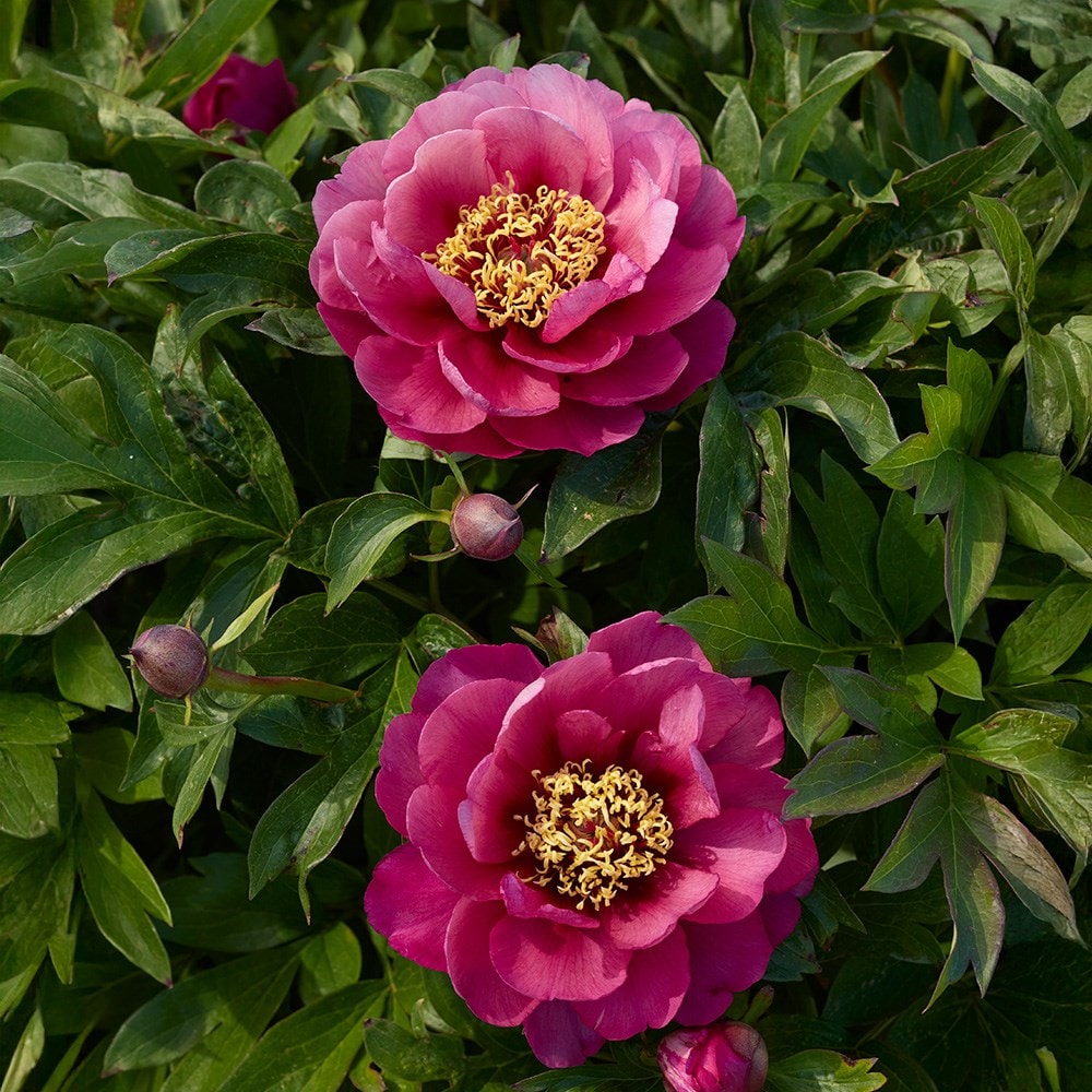 This unique intersectional peony combines the best traits of herbaceous and tree peonies, resulting in a dense, bushy plant adorned with large, deeply divided green leaves. The striking semi-double blooms emerge in late spring to early summer, showcasing a rich rose-pink hue with small purple flares at the base. Each magnificent flower is beautifully arranged around a centre filled with golden stamens, and as the plant matures, the prolific flowering becomes even more impressive. Paeonia 'Yankee Doodle Dandy' is rightly celebrated for its abundant blooms and lush foliage, as well as being deer and mildew resistant, offering a striking and healthy focal point in borders and perennial beds.