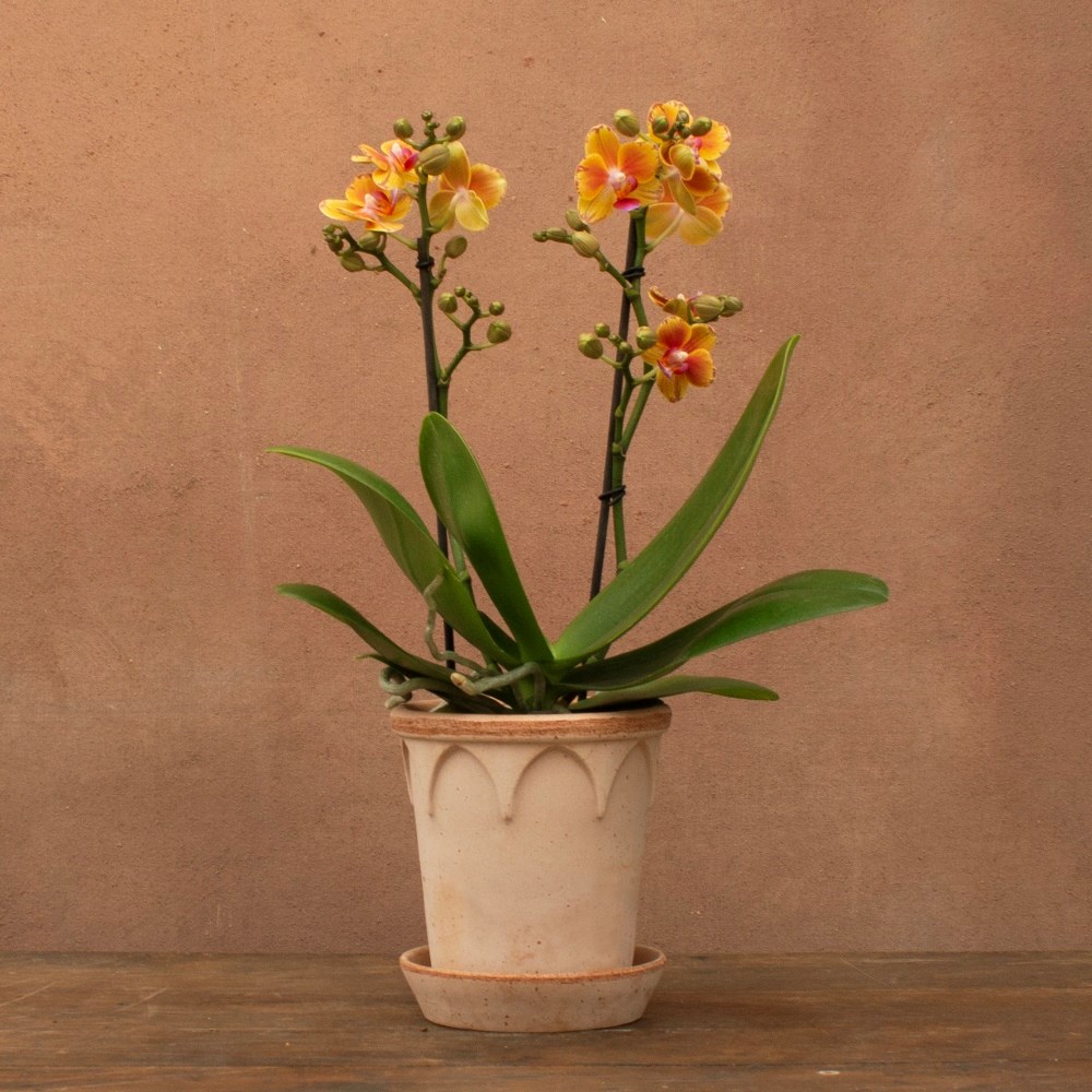 Bright and striking, this tropical moth orchid brings a vivid burst of colour to indoor spaces. Its rounded petals display a blend of golden yellow and fiery orange, brushed with hints of red and pink that intensify toward the centre. The blooms have a waxy texture and excellent longevity, appearing in succession along strong, upright stems.