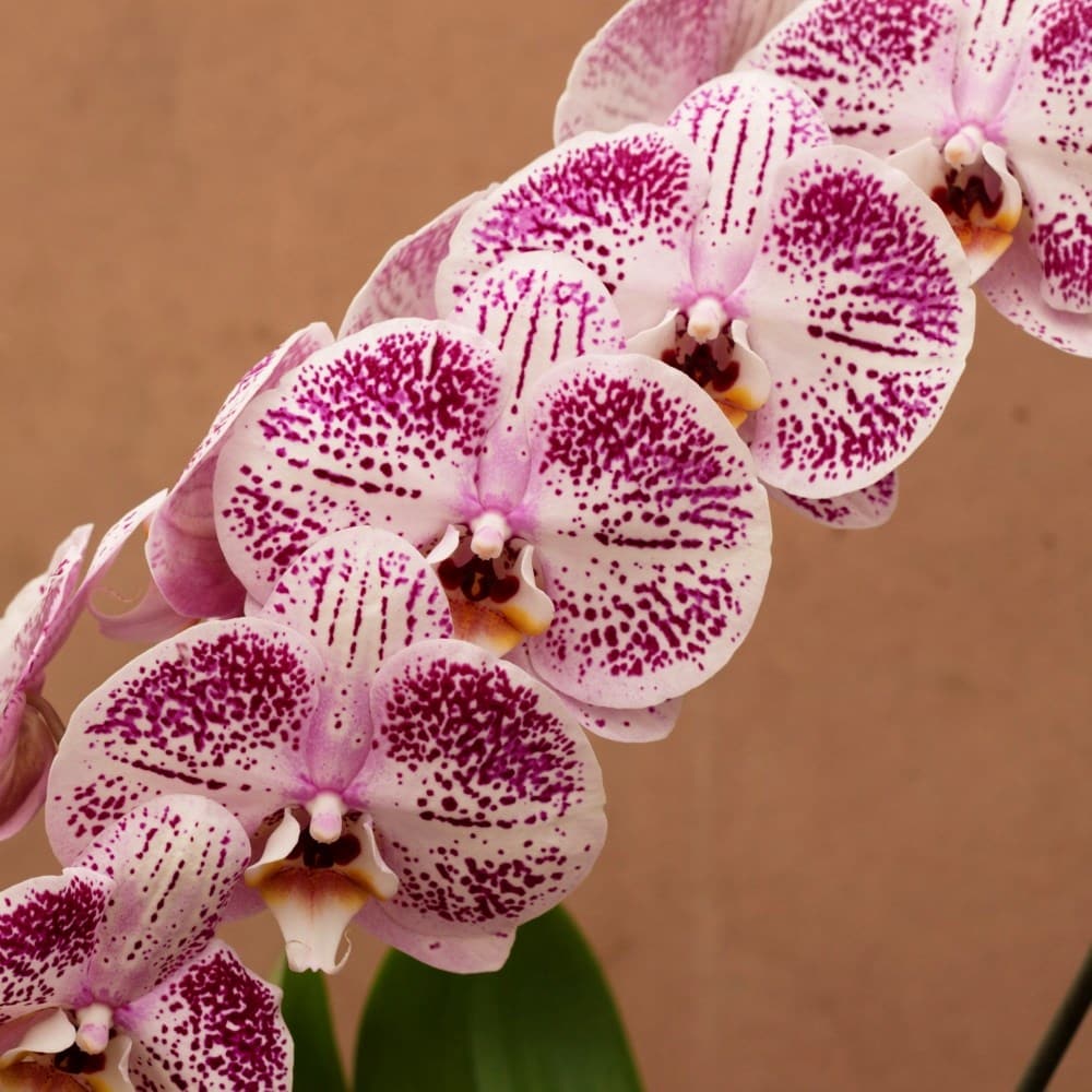 A striking moth orchid with cascading blooms that emulate a dramatic waterfall effect. Each flower features white petals beautifully speckled and veined with rich pink-purple tones, centred with a warm yellow lip. The arching stems rise gracefully from a base of broad, glossy green leaves. Ideal for bright rooms, it thrives in steady warmth and indirect light.