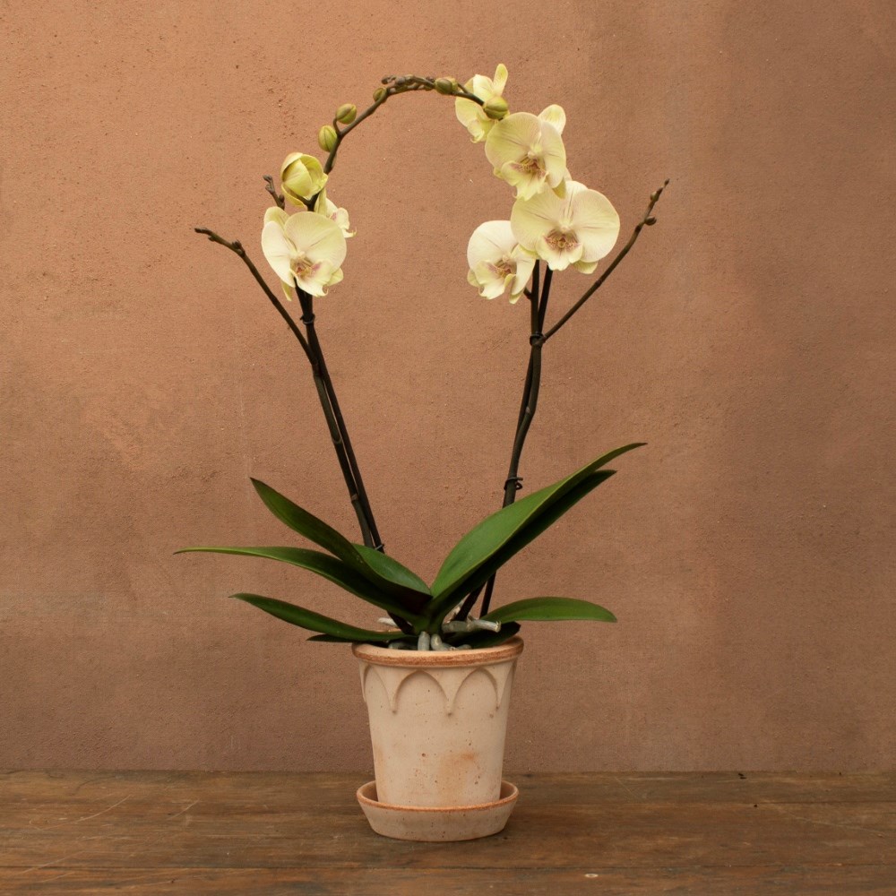 Elegant and refined, Phalaenopsis ‘Optistar Turner’ produces soft, creamy-yellow blooms touched with faint pink veining and a gently speckled centre. Its broad, rounded petals form balanced, symmetrical flowers that arch gracefully along slender, dark stems.