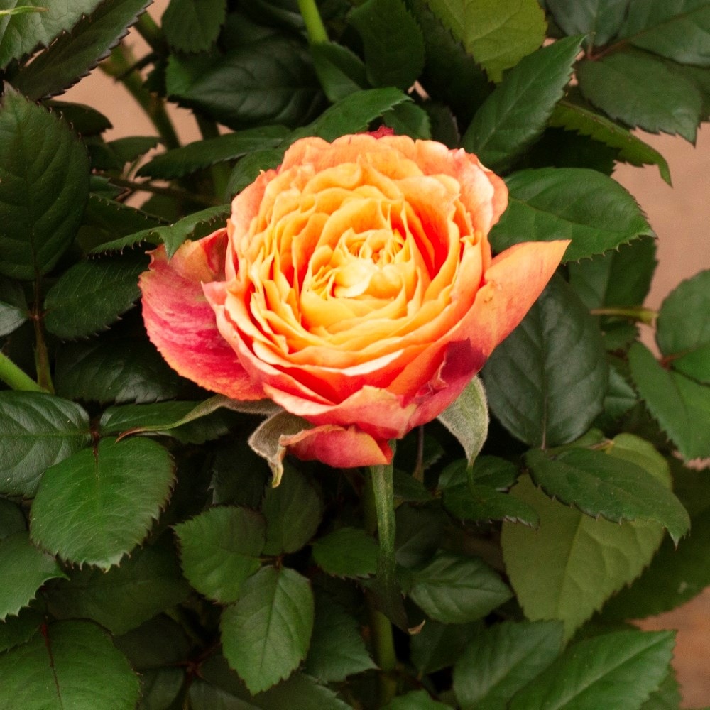 Warm and vibrant, this compact rose makes a striking flowering houseplant and and an ideal longer lasting gift alternative to a bouquet of flowers. Its rich orange blooms open in layers of soft, ruffled petals, blending tones of apricot and tangerine that deepen towards the edges.