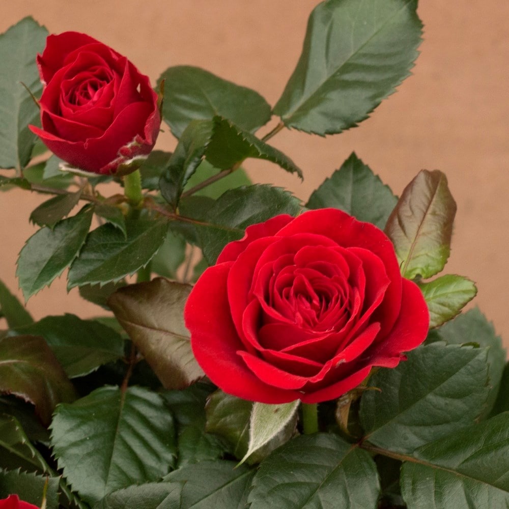 Bold and classic, this compact red rose brings instant elegance and warmth indoors. Its deep crimson blooms unfold in perfect, velvety layers above a base of glossy, dark green leaves. The upright, bushy habit keeps the plant neat and full, making it ideal for bright rooms, windowsills, or as a lasting gift.