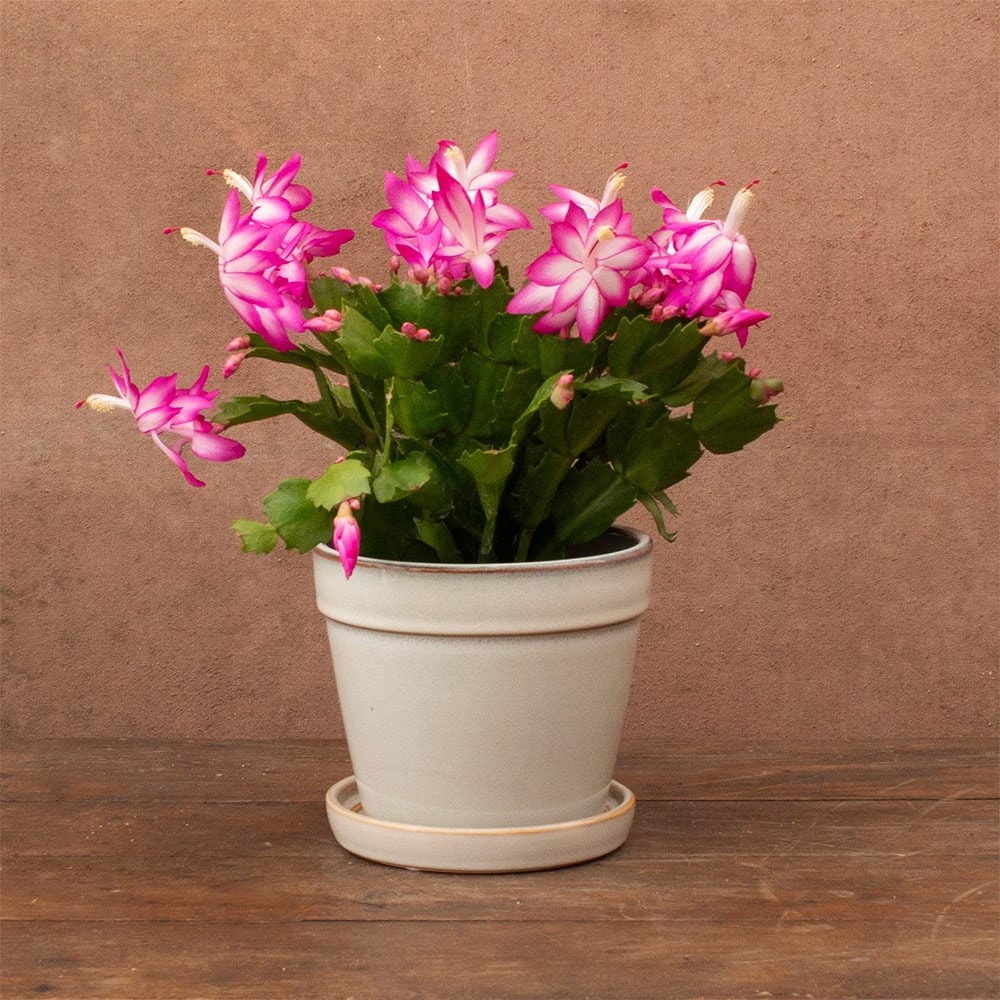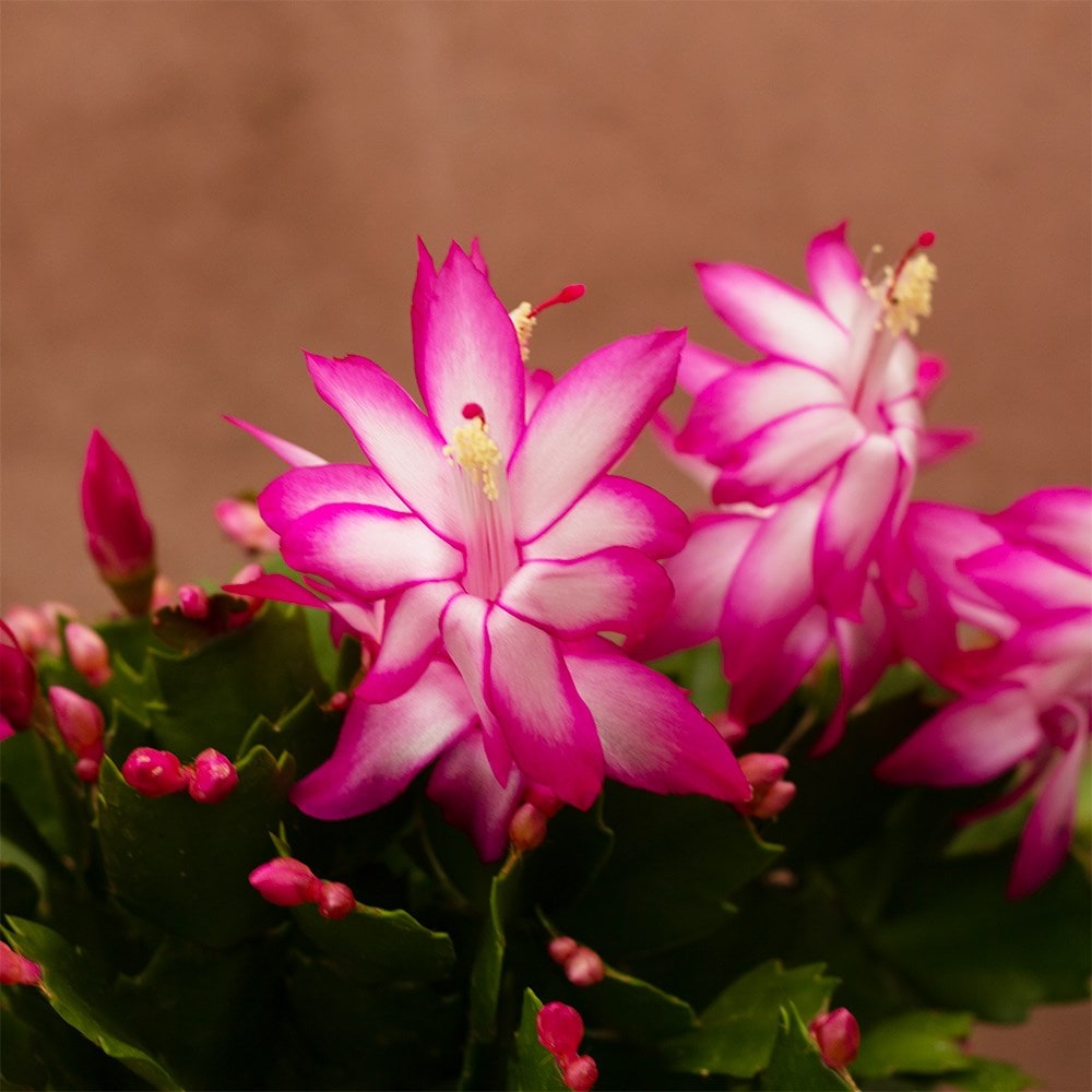 - Home care: Choose a bright spot out of direct sunlight and maintain a humid atmosphere by daily misting or standing <>Schlumbergera on a saucer of wettened gravel. The The needs two resting periods so after it has flowered in late January reduce the watering and move to a cooler room with a temperature of approx 54-59°F (12-15°C). Water sparingly but don't let it dry out. From April to September, increase watering and feed with a liquid houseplant fertiliser, moving the plant to a warmer room with a temperature of around 64-68°F (18-20°C). The flower buds should start to form in mid-September, so reduce the temperature and watering as before for the 2nd resting period. Once the flower buds have developed you again increase the temperature and watering. This should ensure a lovely Christmas floral display. For healthy growth, it is best to repot every year at the end of March using a cactus potting compost or John Innes No. 2 with added grit.
