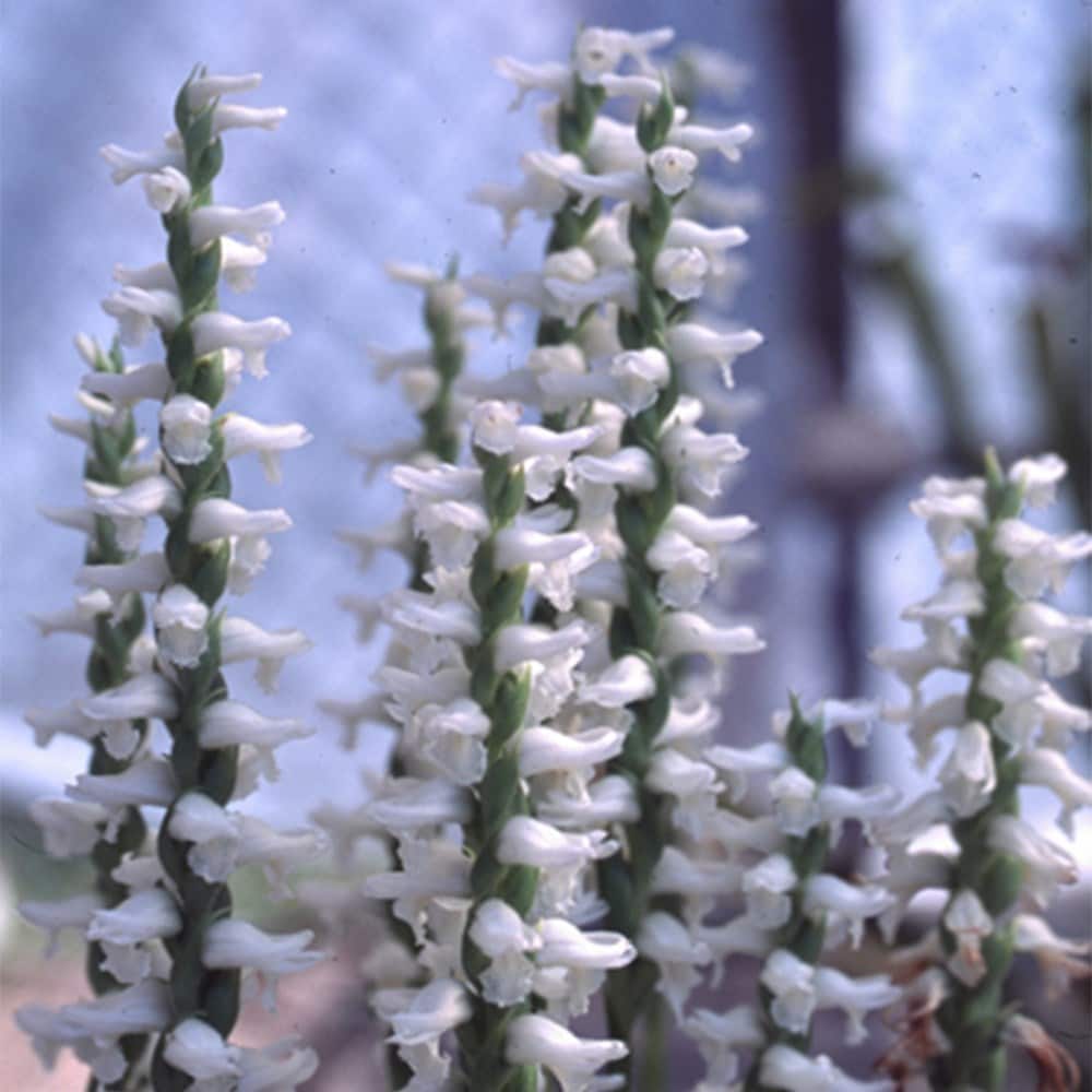 Add a touch of late-season magic to your garden with spikes of elegant, fragrant white flowers that appear from late summer into autumn. Each bloom nods gracefully along spirally arranged stems, with a subtle yellow mark on the lip and a scent reminiscent of vanilla and jasmine. The contrast of delicate flowers above a tidy rosette of upright, strappy green leaves makes it a standout in borders, woodland edges, or beside ponds.