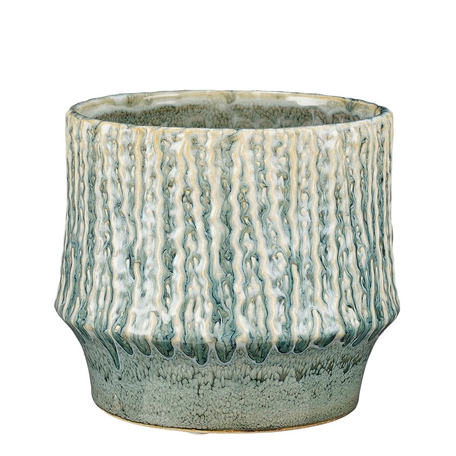 An easygoing ceramic pot with soft, flowing shades of blue, ivory and grey that drift across a gently ridged surface. The textured glaze gives it a natural, relaxed look that will flatter any planting and sit easily in any room.