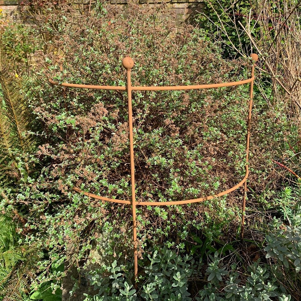 This robustly built steel support is ideal for helping shrubs to hold their shape. It features three supporting stakes topped with decorative ball tops, joined with a supporting curved metal bar. It’s durable enough to withstand all weathers so once in place you can leave it out all year round. The bare metal will rust with exposure to the elements, and take on a rich brown hue that makes a beautiful foil for foliage.