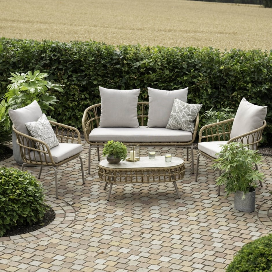 Made for gardens that are lived in rather than just looked at, this wicker lounge set creates an easy, sociable place to spend time outdoors. A two-seater sofa, two armchairs and an oval coffee table come together in a relaxed layout that’s well suited to conversation and shared drinks.