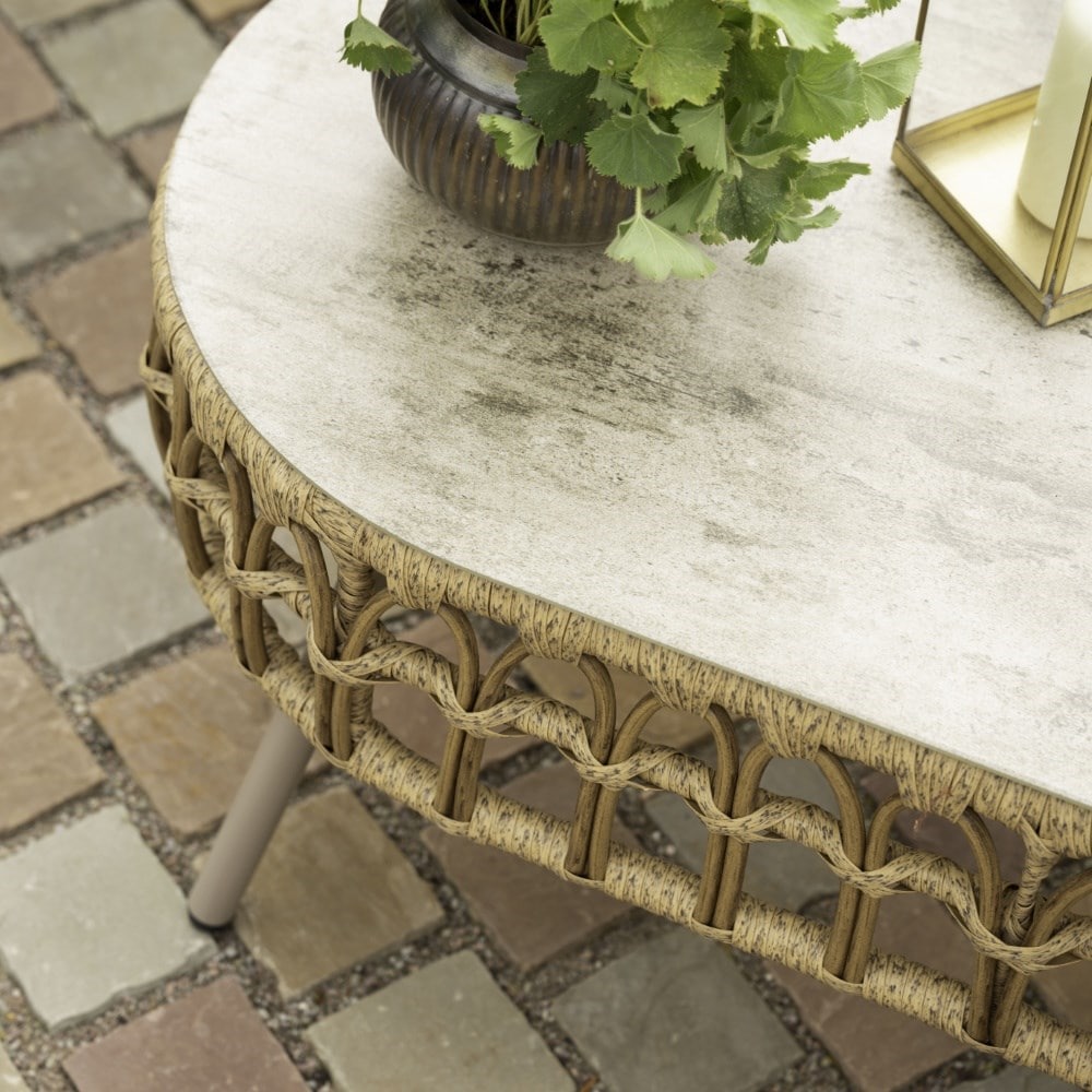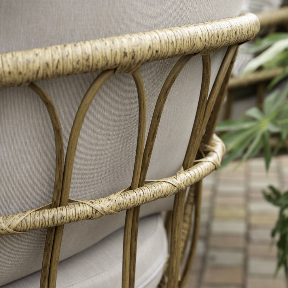 The set is woven in warm-toned wicker for a natural look, supported by a slim powder-coated steel frame that keeps it light yet sturdy. Well-proportioned cushions add comfort, with covers made from 220gsm solution-dyed polyester for lasting colour and durability.