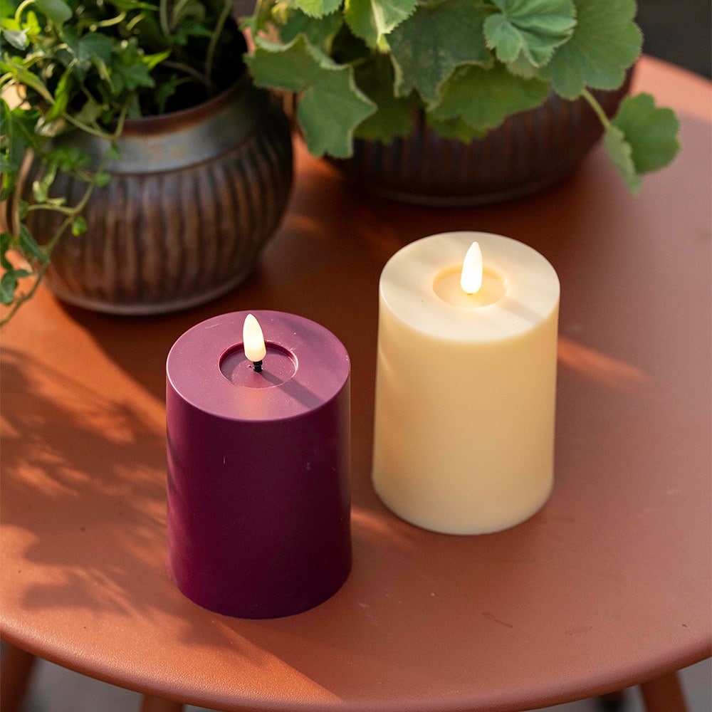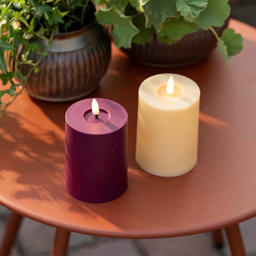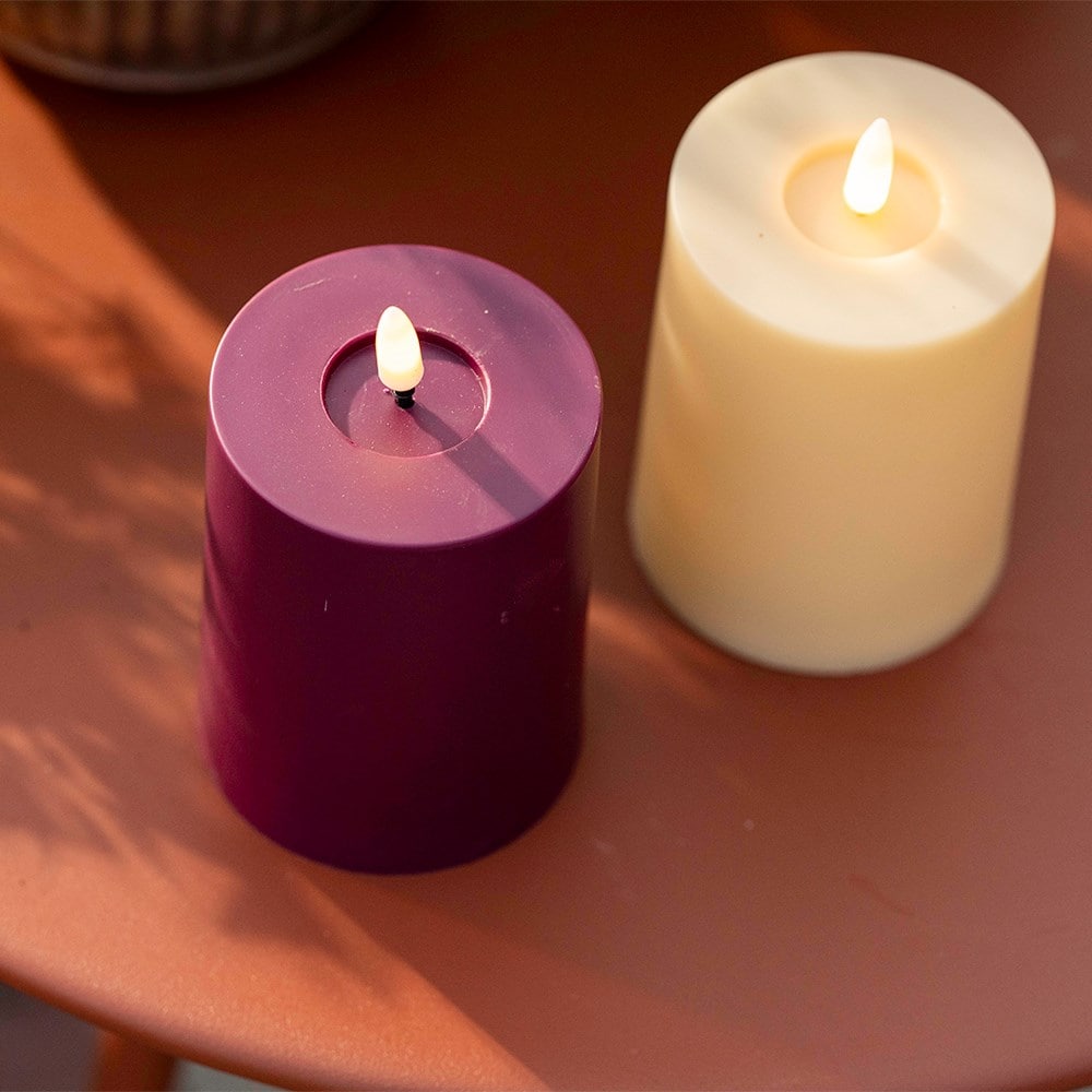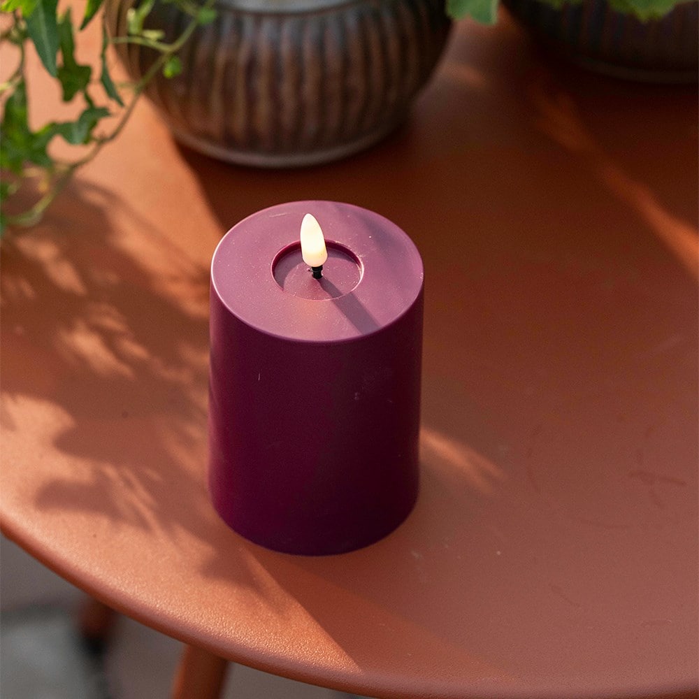 Bring a touch of colour and some cosy lighting to the garden with this berry red LED candle. The warm white LED wick flickers gently, giving the effect of real candlelight without heat or smoke. Perfect for adding atmosphere to evening gatherings.