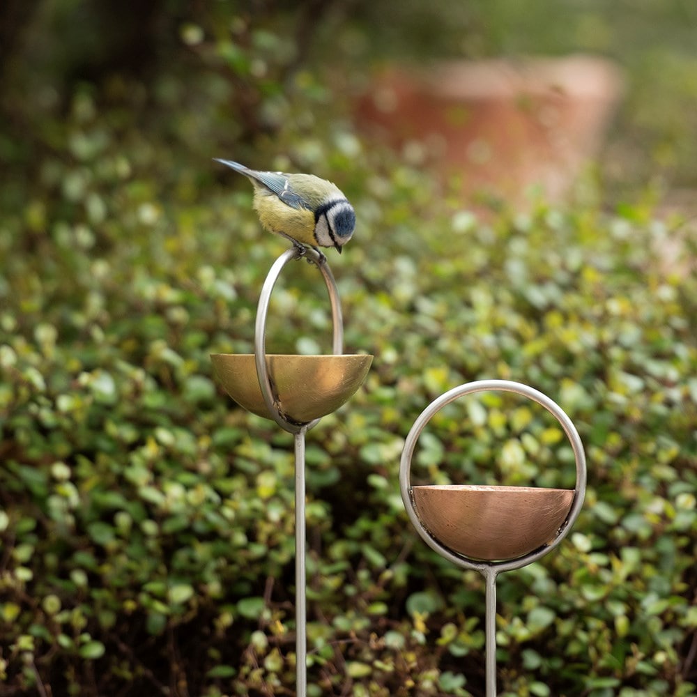 The ring and stake are made of stainless steel and the bowl is brushed copper. The copper is left bare and will tarnish nicely after a little while in the garden. Please remember to wipe out the bowl when replenishing the food.