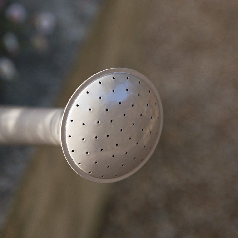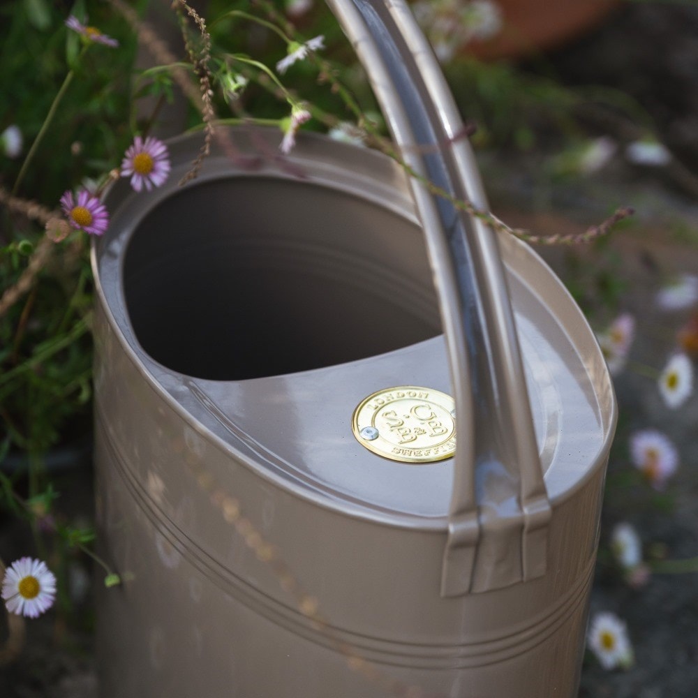 A compact, sturdy 5 litre watering can in galvanised steel with a soft truffle brown powder coat. The slimline shape can be carried tight to your body, reducing strain on your arms. It holds a good volume of water without being overly heavy.